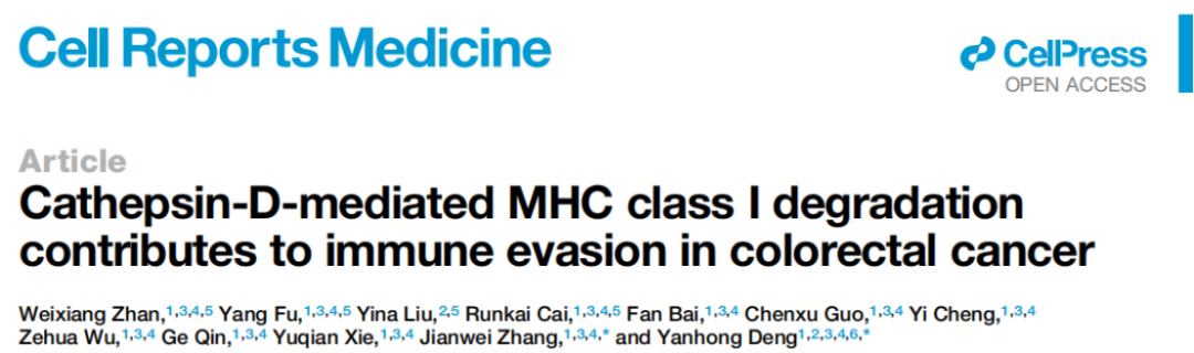 近日,我院副院长、肿瘤科邓艳红教授团队在Cell子刊Cell Reports Medicine(IF=10.6)发表题为Cathepsin-D-mediated MHC class I degradation contributes to immune evasion in colorectal cancer的研究论文,该研究揭示了组织蛋白酶D(CTSD)通过与MHC-I分子结合,促进MHC-I分子降解,导致结直肠癌发生免疫逃逸的机制,为提高结直肠癌免疫治疗疗效提供了新靶点。